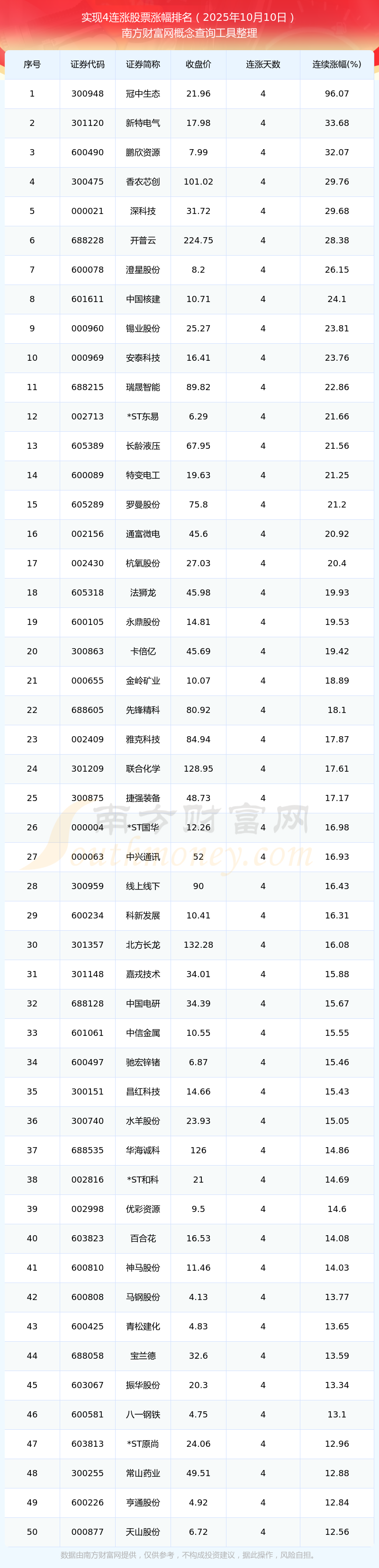 2025年10月10日實現(xiàn)4連漲股票漲幅排名