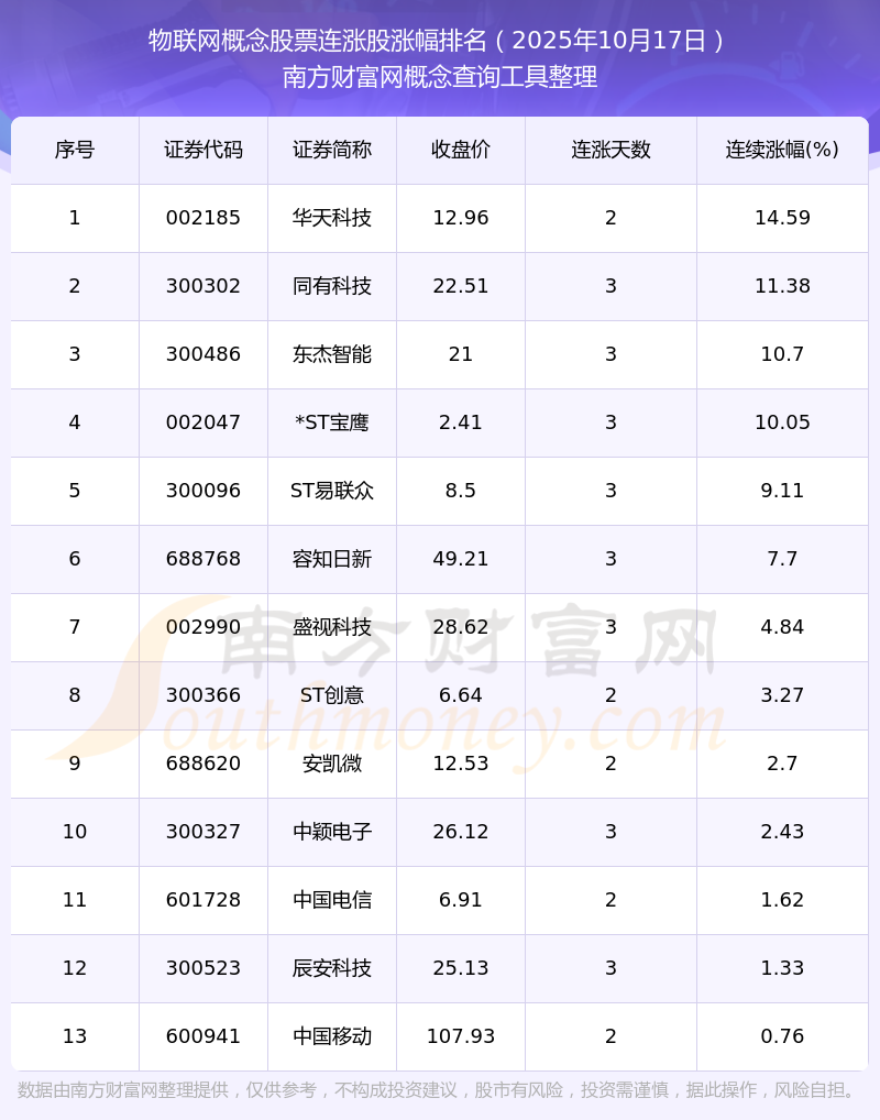 2025年10月17日物聯(lián)網(wǎng)概念股票連漲股漲幅排名