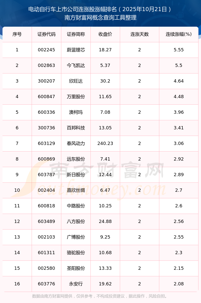 2025年10月21日電動(dòng)自行車(chē)上市公司連漲股漲幅排名