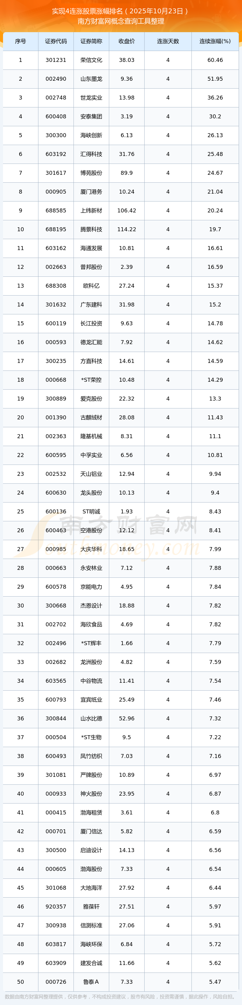 2025年10月23日實(shí)現(xiàn)4連漲股票漲幅排名