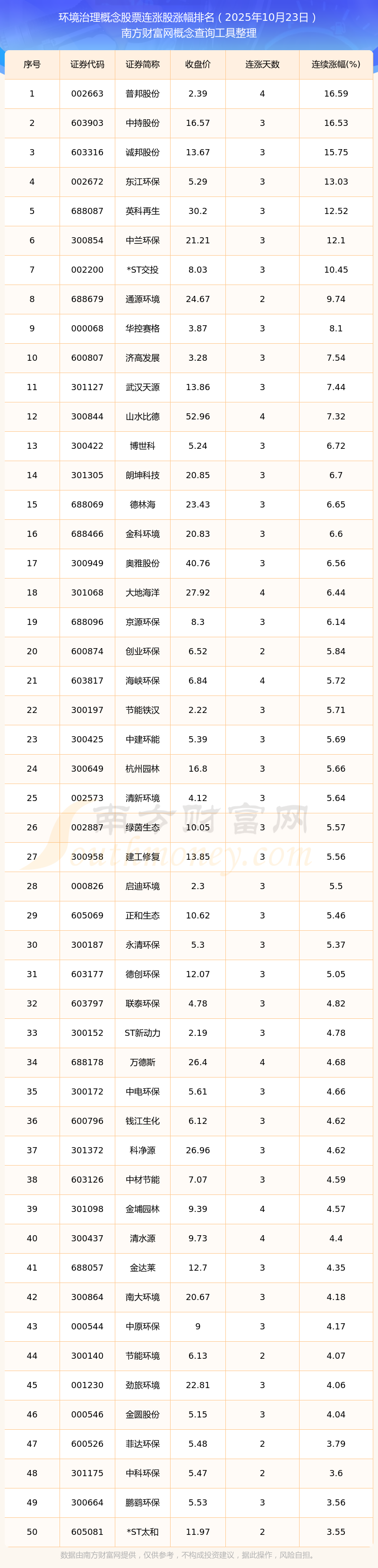2025年10月23日環(huán)境治理概念股票連漲股漲幅排名