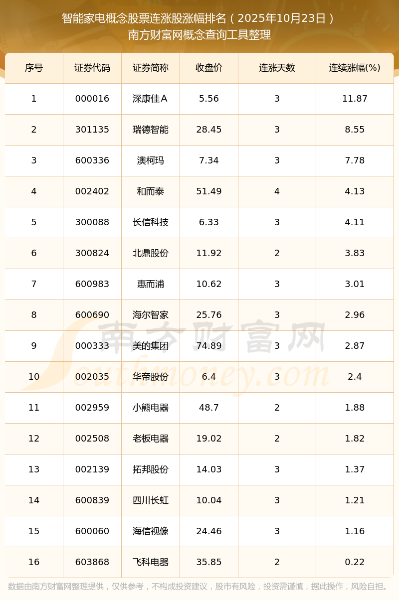 2025年10月23日智能家電概念股票連漲股漲幅排名