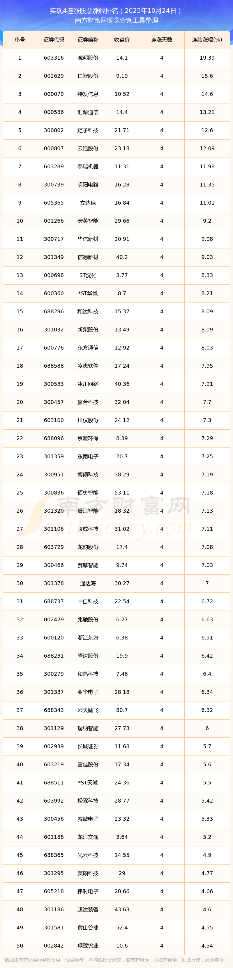 根據南方財富網概念查詢工具數據統(tǒng)計,截止2025年10月24日收盤,共有60只個股實現4天連漲。其中連續(xù)漲幅較大的個股有誠邦股份、仁智股份、特發(fā)信息等,連續(xù)漲幅分別為19.39%、15.60%、14.60%。