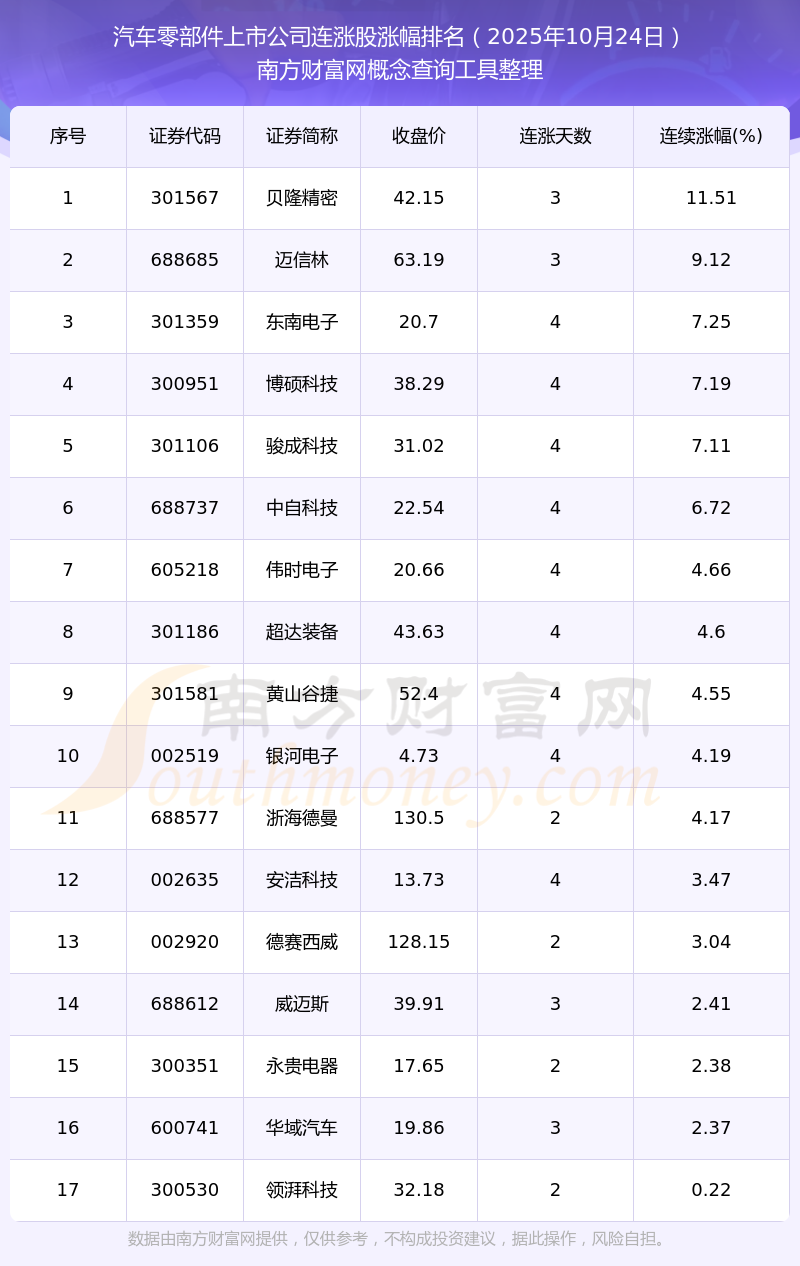 2025年10月24日汽車零部件上市公司連漲股漲幅排名