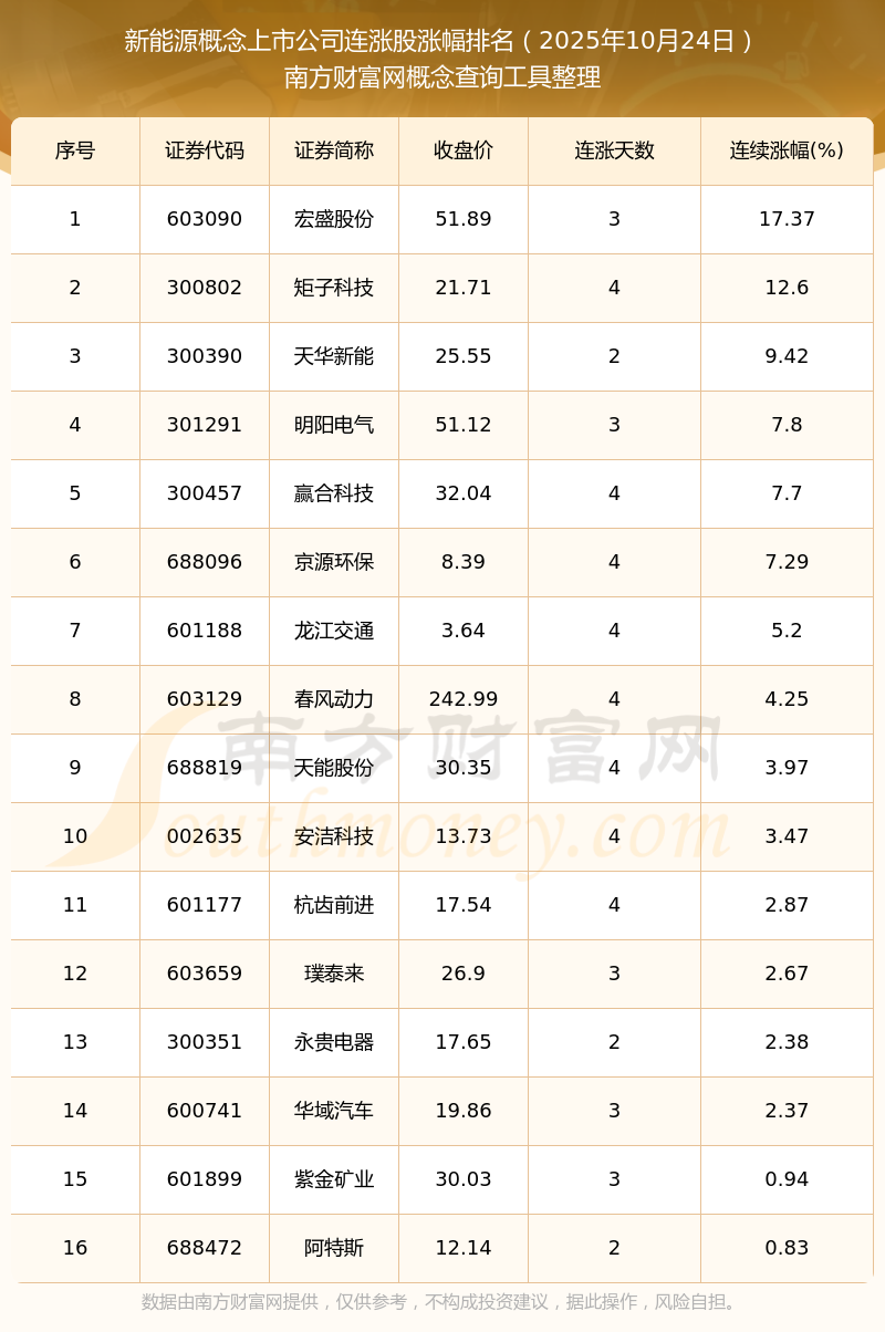 根據(jù)南方財富網(wǎng)概念查詢工具數(shù)據(jù)統(tǒng)計,截止2025年10月24日收盤,新能源概念上市公司共有16只個股實現(xiàn)連漲。其中連續(xù)漲幅較大的個股有宏盛股份、矩子科技、天華新能等,連續(xù)漲幅分別為17.37%、12.60%、9.42%。