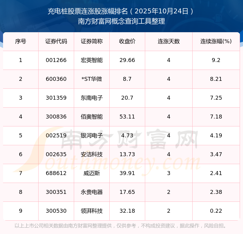 根據(jù)南方財富網(wǎng)概念查詢工具數(shù)據(jù)統(tǒng)計,截止2025年10月24日收盤,充電樁股票共有9只個股實現(xiàn)連漲。其中連續(xù)漲幅較大的個股有宏英智能、*ST華微、東南電子等,連續(xù)漲幅分別為9.20%、8.21%、7.25%。