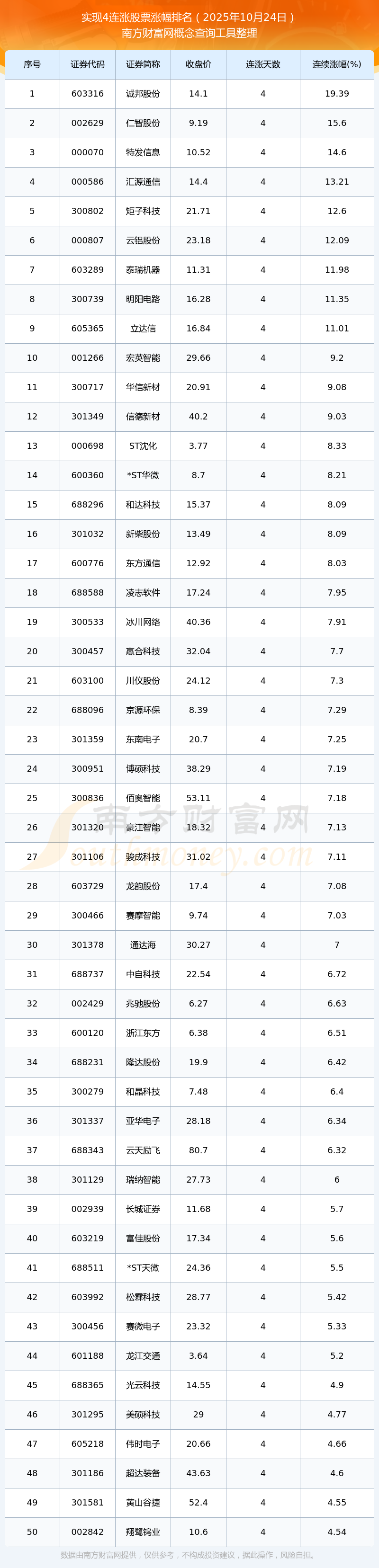 根據(jù)南方財富網(wǎng)概念查詢工具數(shù)據(jù)統(tǒng)計,截止2025年10月24日收盤,共有60只個股實現(xiàn)4天連漲。其中連續(xù)漲幅較大的個股有誠邦股份、仁智股份、特發(fā)信息等,連續(xù)漲幅分別為19.39%、15.60%、14.60%。 2025年10月24日實現(xiàn)4連漲股票漲幅排名 數(shù)據(jù)由南方財富網(wǎng)整理提