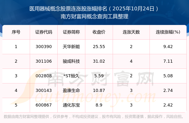 2025年10月24日醫(yī)用器械概念股票連漲股漲幅排名