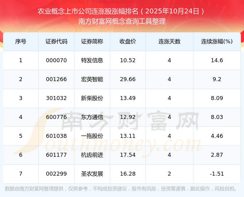 根據(jù)南方財(cái)富網(wǎng)概念查詢(xún)工具數(shù)據(jù)統(tǒng)計(jì),截止2025年10月24日收盤(pán),農(nóng)業(yè)概念上市公司共有7只個(gè)股實(shí)現(xiàn)連漲。其中連續(xù)漲幅較大的個(gè)股有特發(fā)信息、宏英智能、新柴股份等,連續(xù)漲幅分別為14.60%、9.20%、8.09%。