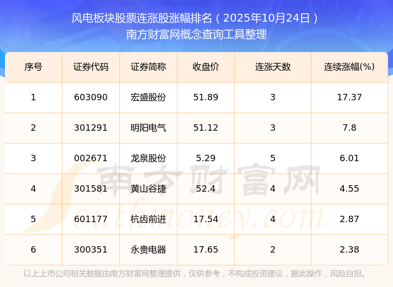 2025年10月24日風電板塊股票連漲股漲幅排名