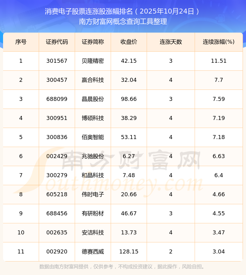 根據(jù)南方財富網(wǎng)概念查詢工具數(shù)據(jù)統(tǒng)計,截止2025年10月24日收盤,消費電子股票共有11只個股實現(xiàn)連漲。其中連續(xù)漲幅較大的個股有貝隆精密、贏合科技、晶晨股份等,連續(xù)漲幅分別為11.51%、7.70%、7.59%。