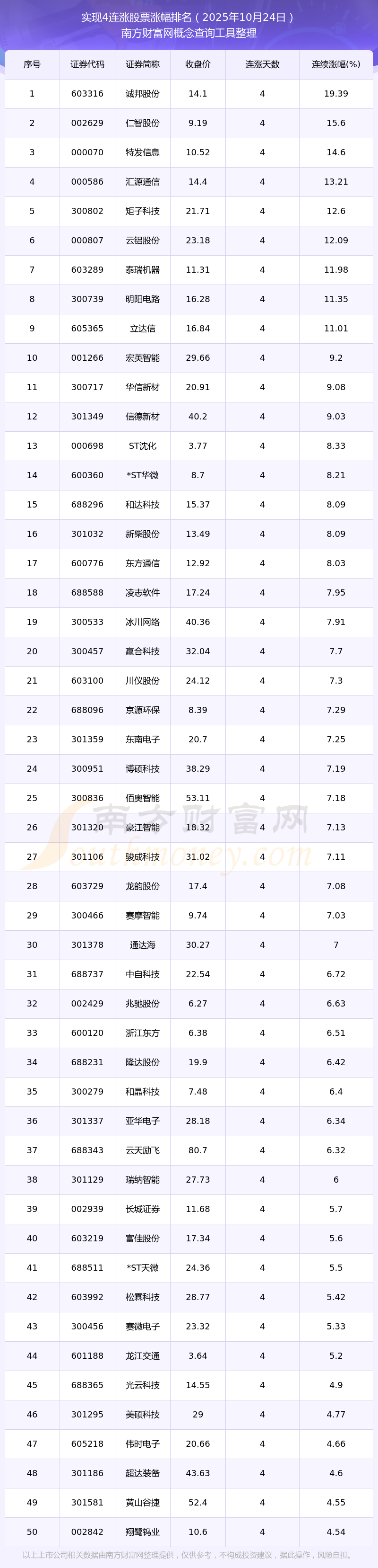 根據南方財富網概念查詢工具數據統(tǒng)計,截止2025年10月24日收盤,共有60只個股實現4天連漲。其中連續(xù)漲幅較大的個股有誠邦股份、仁智股份、特發(fā)信息等,連續(xù)漲幅分別為19.39%、15.60%、14.60%。