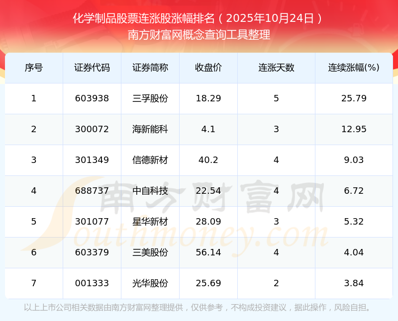 根據(jù)南方財富網(wǎng)概念查詢工具數(shù)據(jù)統(tǒng)計,截止2025年10月24日收盤,化學(xué)制品股票共有7只個股實現(xiàn)連漲。其中連續(xù)漲幅較大的個股有三孚股份、海新能科、信德新材等,連續(xù)漲幅分別為25.79%、12.95%、9.03%。