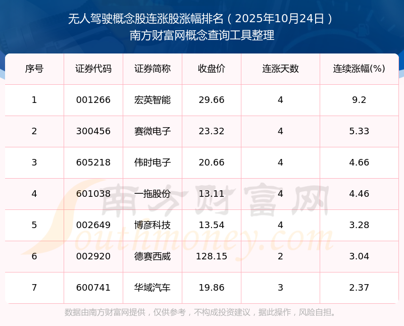 2025年10月24日無人駕駛概念股連漲股漲幅排名