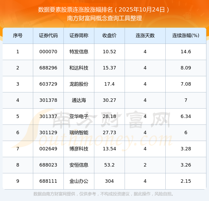 2025年10月24日數(shù)據(jù)要素股票連漲股漲幅排名
