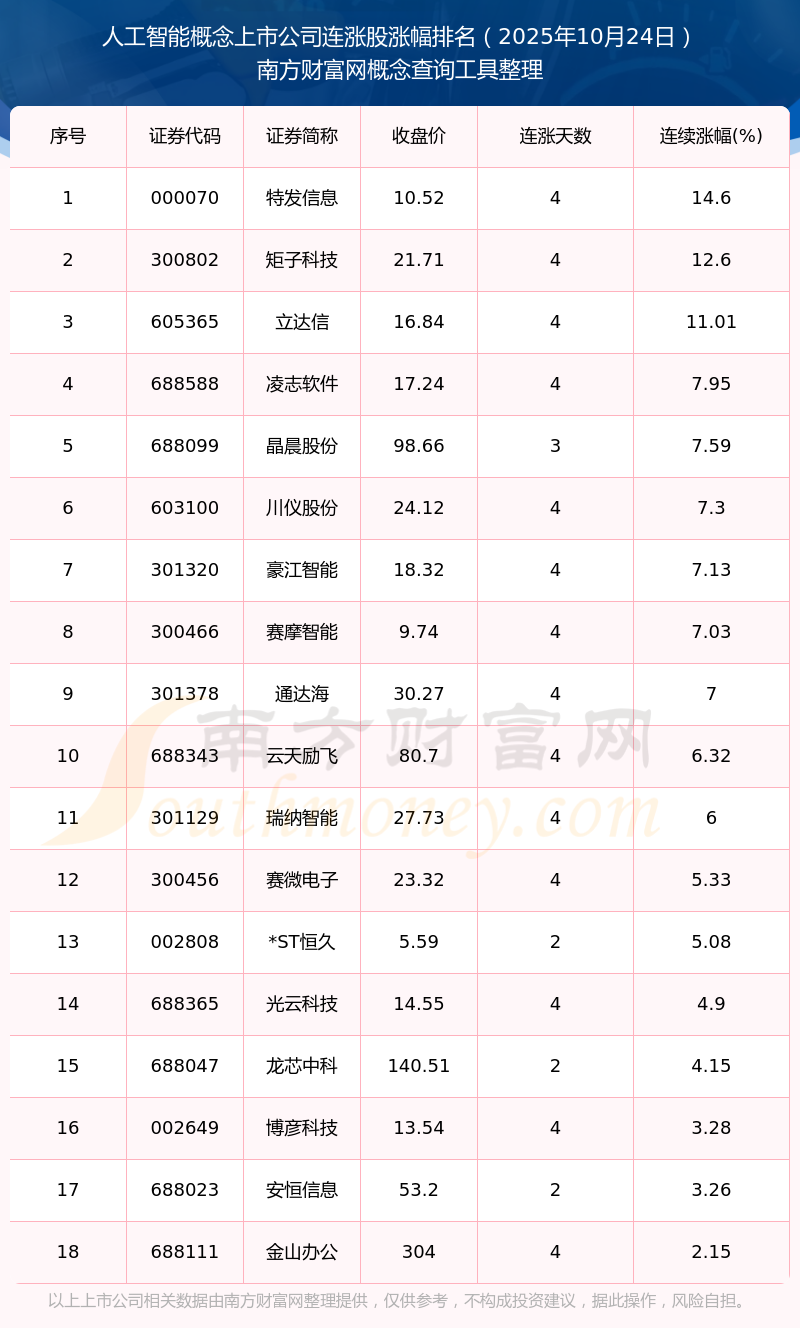 2025年10月24日人工智能概念上市公司連漲股漲幅排名