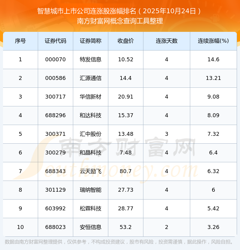 2025年10月24日智慧城市上市公司連漲股漲幅排名