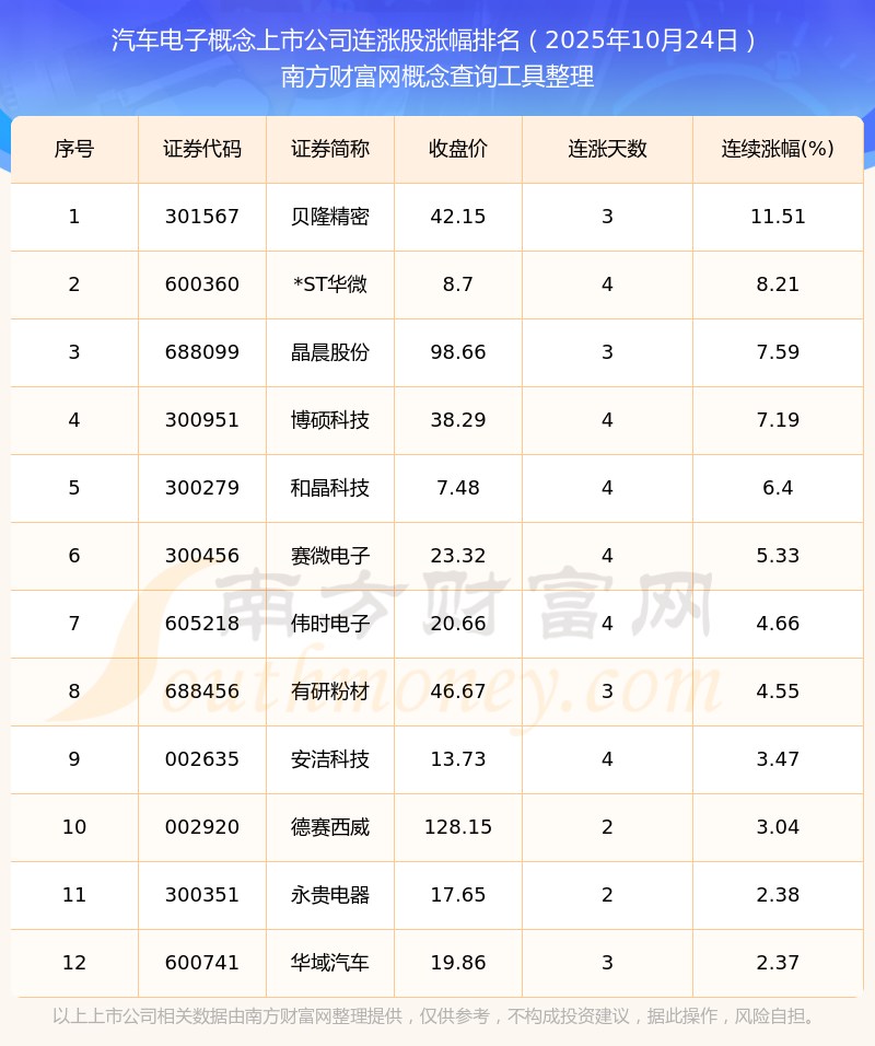 2025年10月24日汽車(chē)電子概念上市公司連漲股漲幅排名