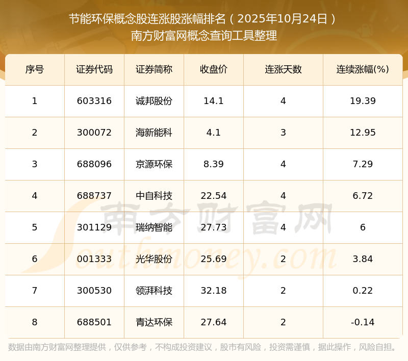 根據(jù)南方財富網(wǎng)概念查詢工具數(shù)據(jù)統(tǒng)計,截止2025年10月24日收盤,節(jié)能環(huán)保概念股共有8只個股實現(xiàn)連漲。其中連續(xù)漲幅較大的個股有誠邦股份、海新能科、京源環(huán)保等,連續(xù)漲幅分別為19.39%、12.95%、7.29%。
