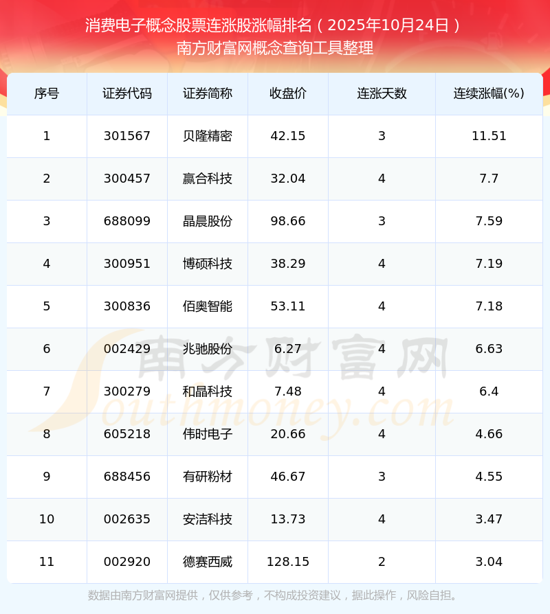 根據(jù)南方財富網(wǎng)概念查詢工具數(shù)據(jù)統(tǒng)計,截止2025年10月24日收盤,消費電子概念股票共有11只個股實現(xiàn)連漲。其中連續(xù)漲幅較大的個股有貝隆精密、贏合科技、晶晨股份等,連續(xù)漲幅分別為11.51%、7.70%、7.59%。