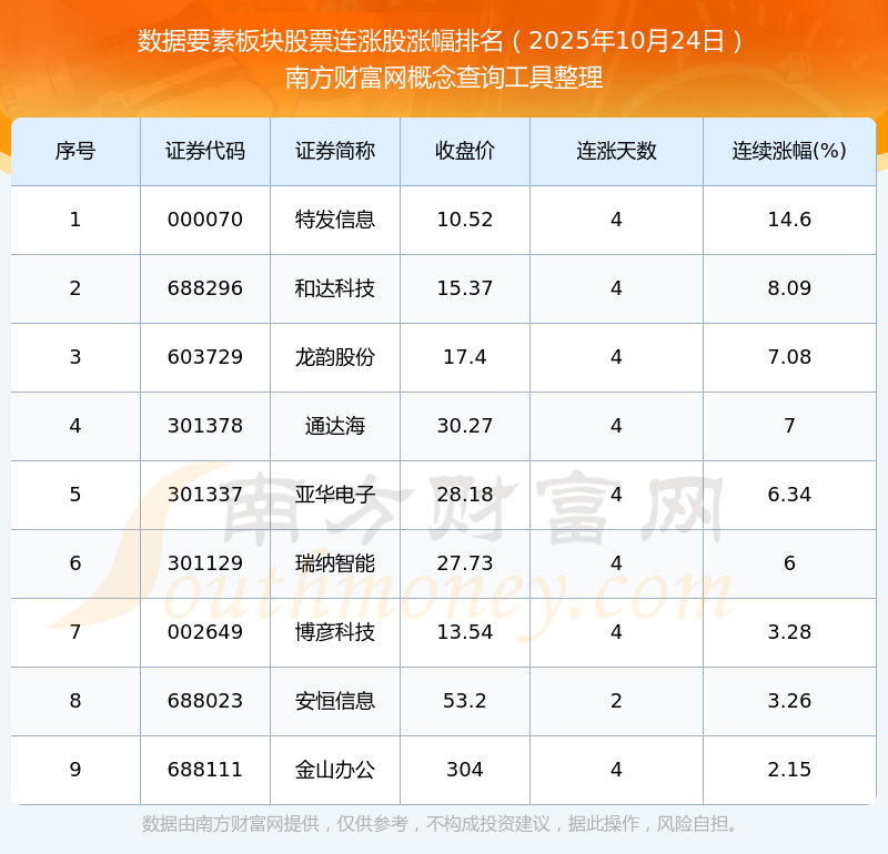 2025年10月24日數(shù)據(jù)要素板塊股票連漲股漲幅排名