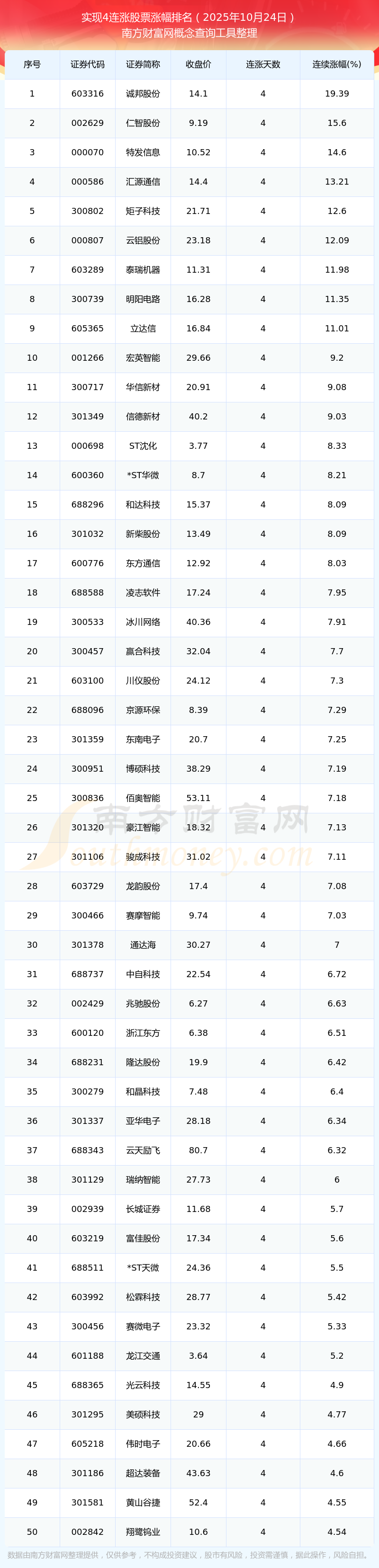 根據(jù)南方財(cái)富網(wǎng)概念查詢工具數(shù)據(jù)統(tǒng)計(jì),截止2025年10月24日收盤(pán),共有60只個(gè)股實(shí)現(xiàn)4天連漲。其中連續(xù)漲幅較大的個(gè)股有誠(chéng)邦股份、仁智股份、特發(fā)信息等,連續(xù)漲幅分別為19.39%、15.60%、14.60%。 2025年10月24日實(shí)現(xiàn)4連漲股票漲幅排名 數(shù)據(jù)由南方財(cái)富網(wǎng)提供,