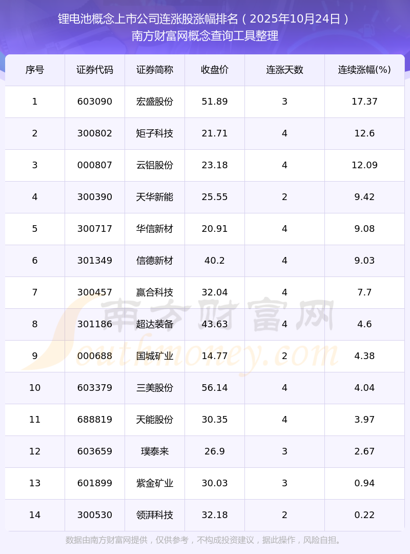 2025年10月24日鋰電池概念上市公司連漲股漲幅排名