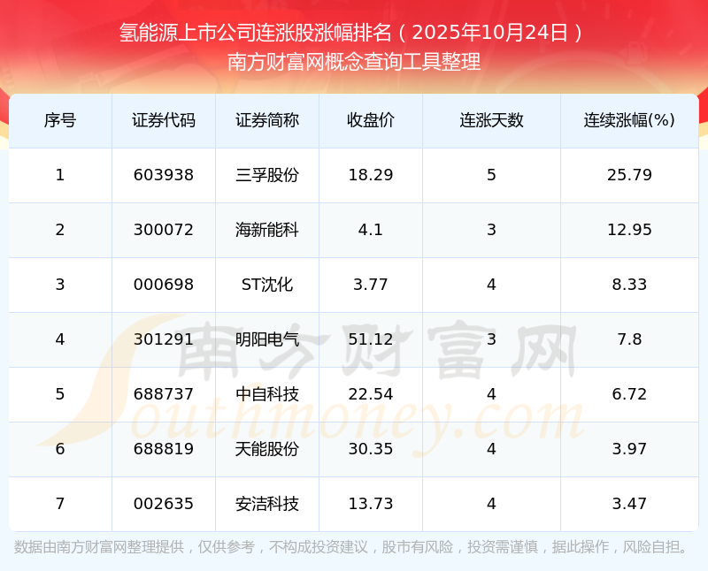 2025年10月24日氫能源上市公司連漲股漲幅排名