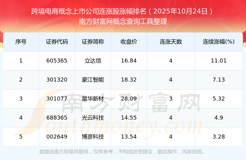 根據(jù)南方財(cái)富網(wǎng)概念查詢工具數(shù)據(jù)統(tǒng)計(jì),截止2025年10月24日收盤,跨境電商概念上市公司共有5只個(gè)股實(shí)現(xiàn)連漲。其中連續(xù)漲幅較大的個(gè)股有立達(dá)信、豪江智能、星華新材等,連續(xù)漲幅分別為11.01%、7.13%、5.32%。