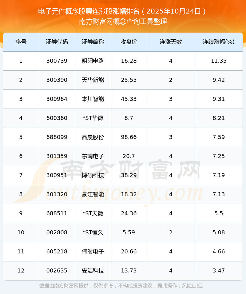 2025年10月24日電子元件概念股票連漲股漲幅排名