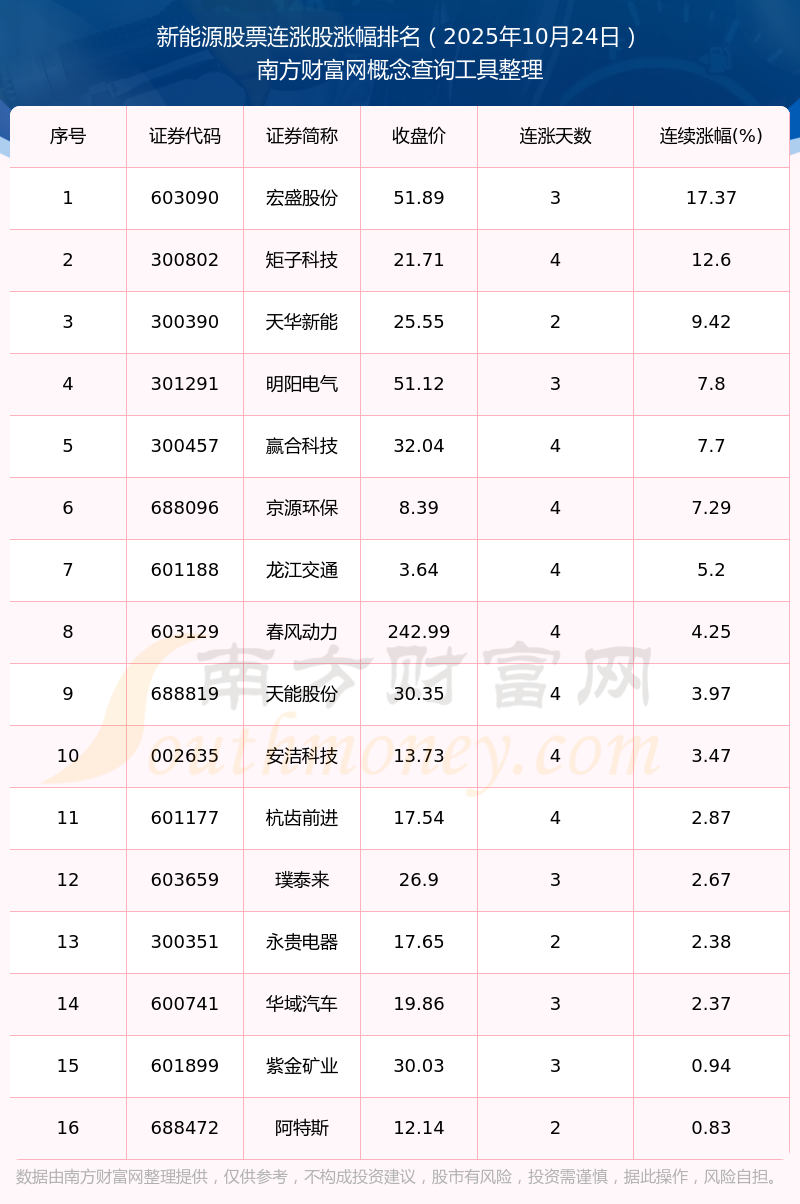 根據(jù)南方財(cái)富網(wǎng)概念查詢工具數(shù)據(jù)統(tǒng)計(jì),截止2025年10月24日收盤,新能源股票共有16只個(gè)股實(shí)現(xiàn)連漲。其中連續(xù)漲幅較大的個(gè)股有宏盛股份、矩子科技、天華新能等,連續(xù)漲幅分別為17.37%、12.60%、9.42%。