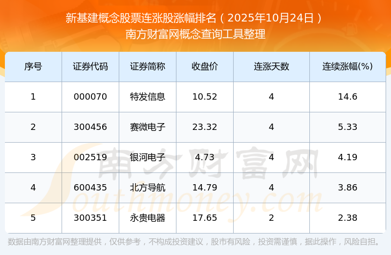 根據南方財富網概念查詢工具數據統(tǒng)計,截止2025年10月24日收盤,新基建概念股票共有5只個股實現連漲。其中連續(xù)漲幅較大的個股有特發(fā)信息、賽微電子、銀河電子等,連續(xù)漲幅分別為14.60%、5.33%、4.19%。