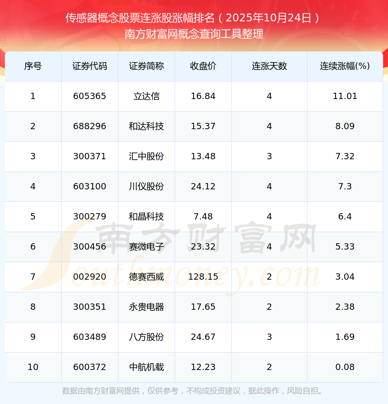 2025年10月24日傳感器概念股票連漲股漲幅排名