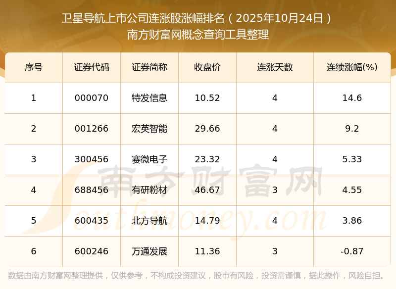 2025年10月24日衛(wèi)星導航上市公司連漲股漲幅排名