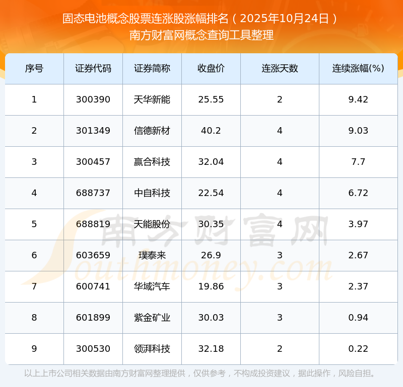 2025年10月24日固態(tài)電池概念股票連漲股漲幅排名