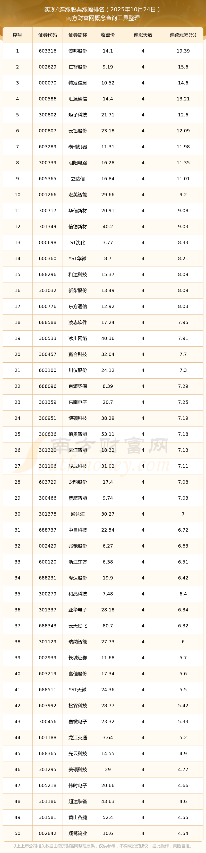 2025年10月24日實(shí)現(xiàn)4連漲股票漲幅排名