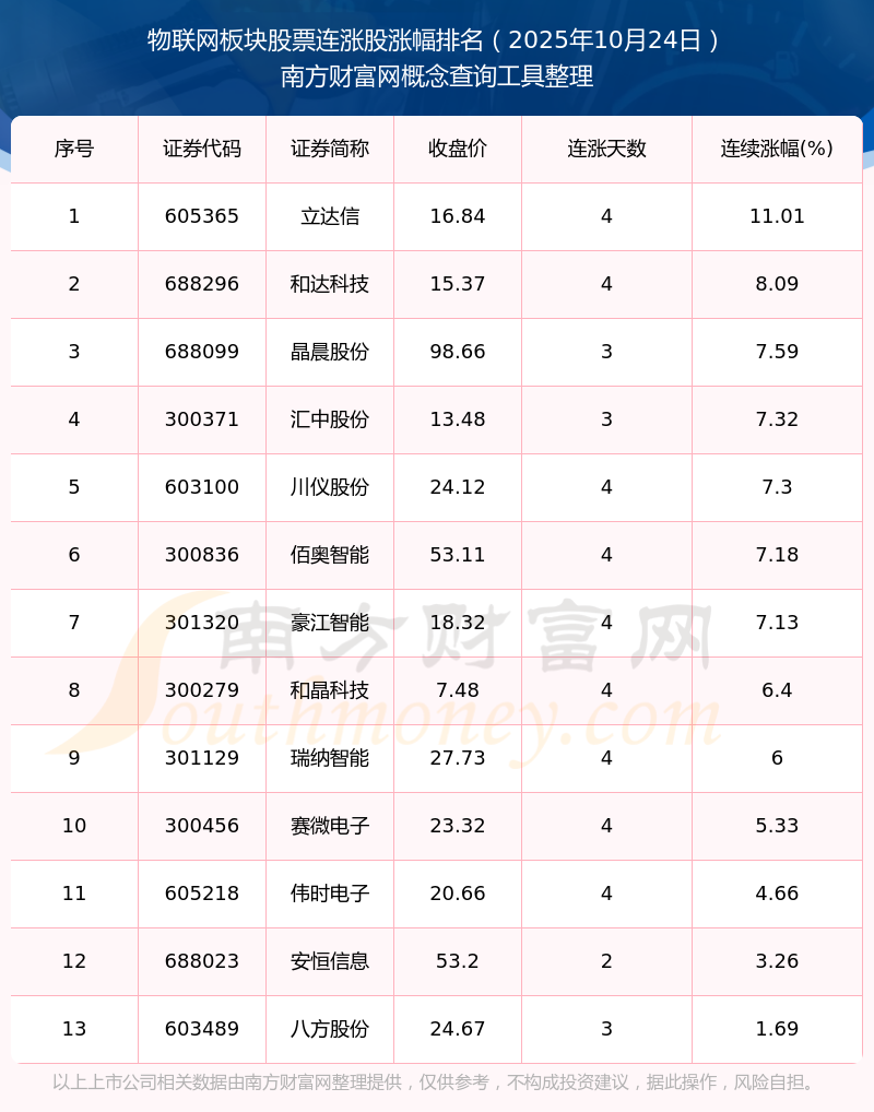 2025年10月24日物聯(lián)網(wǎng)板塊股票連漲股漲幅排名