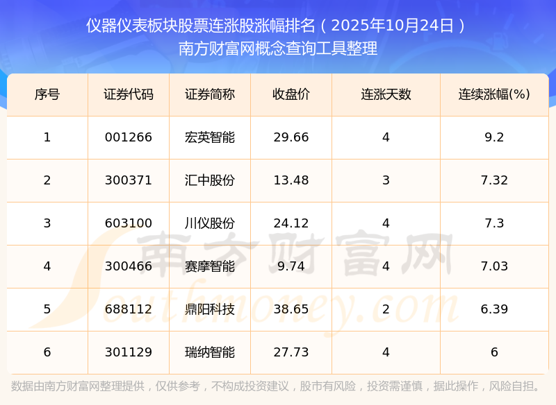 2025年10月24日儀器儀表板塊股票連漲股漲幅排名