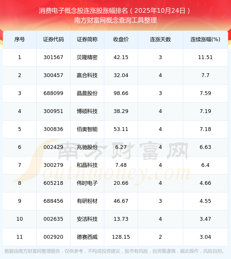 根據(jù)南方財(cái)富網(wǎng)概念查詢工具數(shù)據(jù)統(tǒng)計(jì),截止2025年10月24日收盤,消費(fèi)電子概念股共有11只個(gè)股實(shí)現(xiàn)連漲。其中連續(xù)漲幅較大的個(gè)股有貝隆精密、贏合科技、晶晨股份等,連續(xù)漲幅分別為11.51%、7.70%、7.59%。