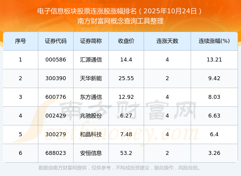 2025年10月24日電子信息板塊股票連漲股票漲幅排名