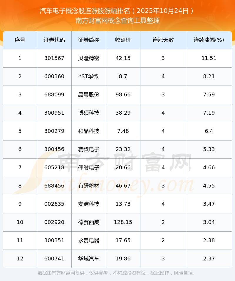 2025年10月24日汽車電子概念股連漲股漲幅排名