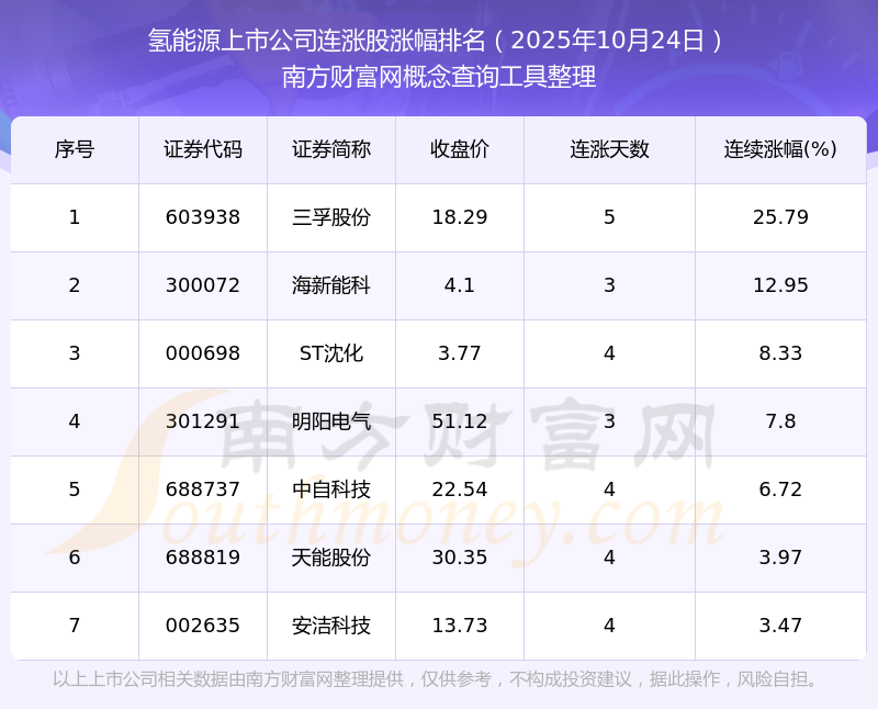 2025年10月24日氫能源上市公司連漲股漲幅排名