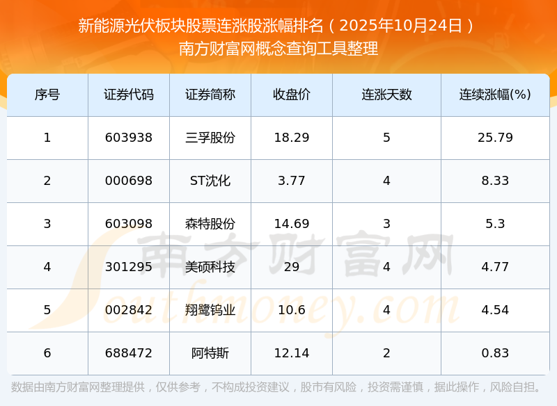 根據(jù)南方財富網(wǎng)概念查詢工具數(shù)據(jù)統(tǒng)計,截止2025年10月24日收盤,新能源光伏板塊股票共有6只個股實現(xiàn)連漲。其中連續(xù)漲幅較大的個股有三孚股份、ST沈化、森特股份等,連續(xù)漲幅分別為25.79%、8.33%、5.30%。