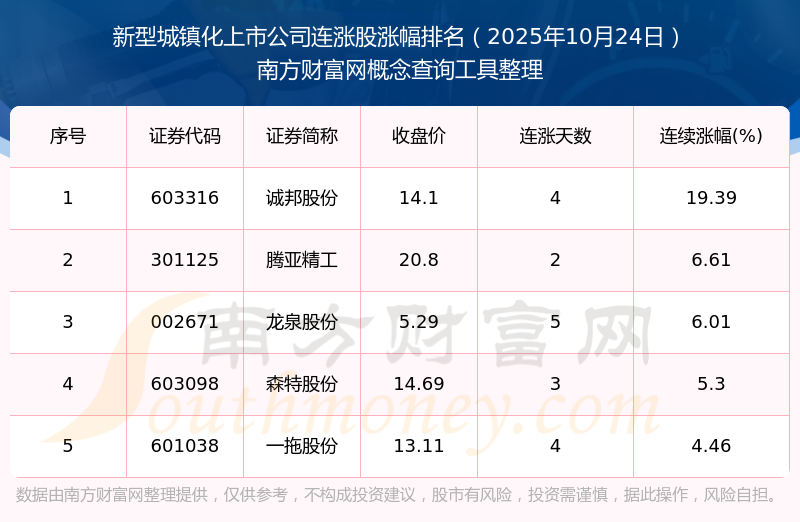 2025年10月24日新型城鎮(zhèn)化上市公司連漲股漲幅排名