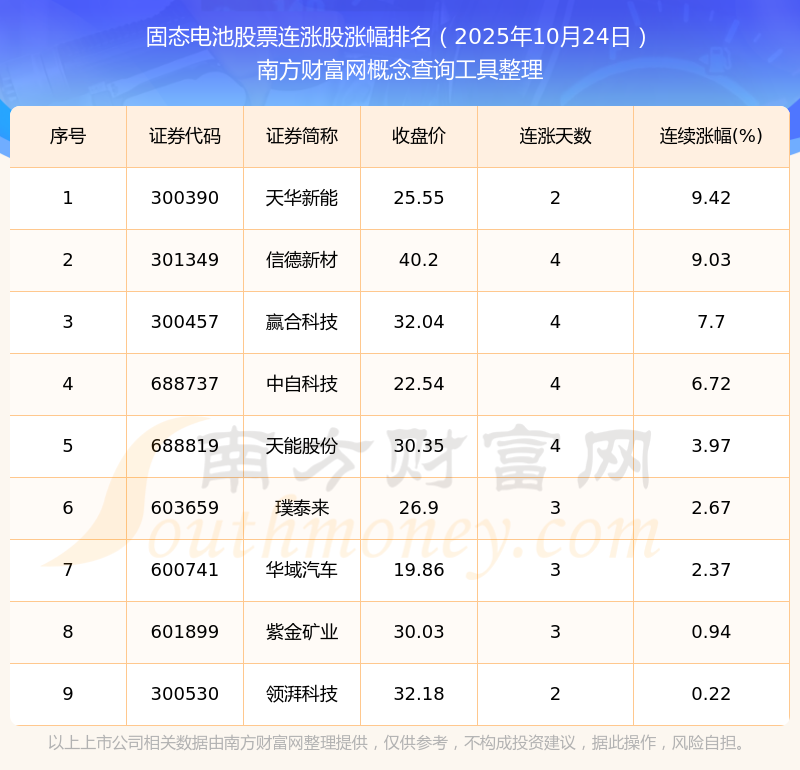 根據(jù)南方財(cái)富網(wǎng)概念查詢工具數(shù)據(jù)統(tǒng)計(jì),截止2025年10月24日收盤,固態(tài)電池股票共有9只個(gè)股實(shí)現(xiàn)連漲。其中連續(xù)漲幅較大的個(gè)股有天華新能、信德新材、贏合科技等,連續(xù)漲幅分別為9.42%、9.03%、7.70%。