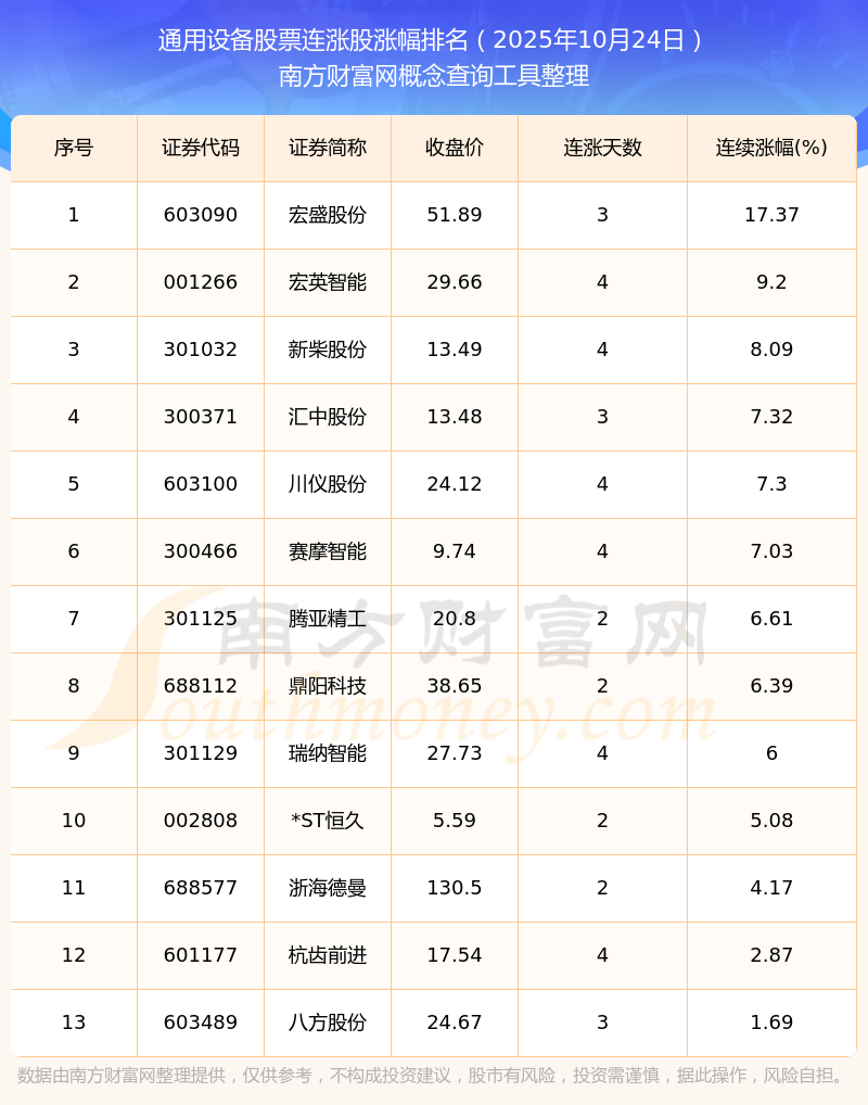 2025年10月24日通用設(shè)備股票連漲股漲幅排名