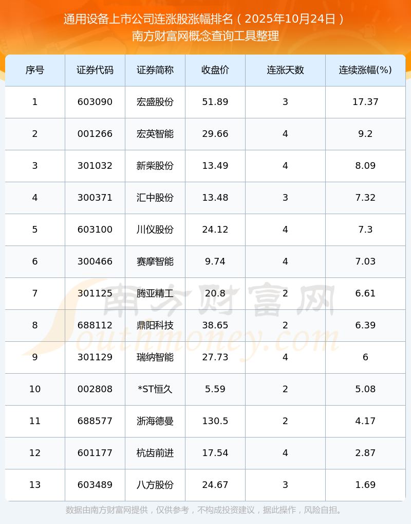 2025年10月24日通用設(shè)備上市公司連漲股漲幅排名