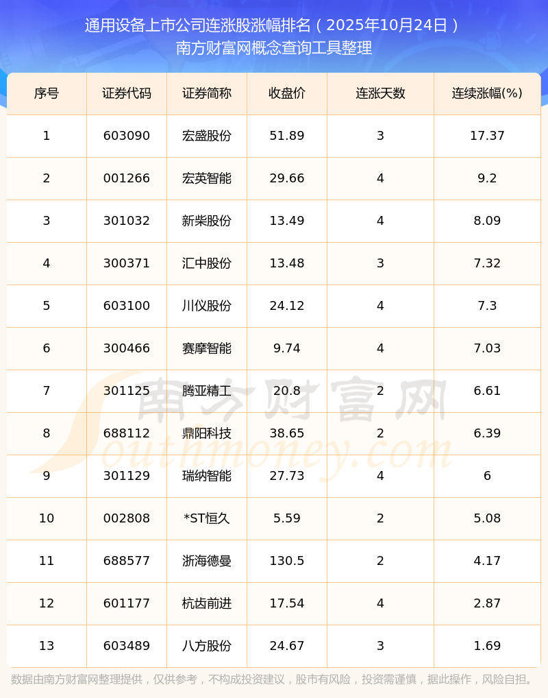 2025年10月24日通用設(shè)備上市公司連漲股漲幅排名