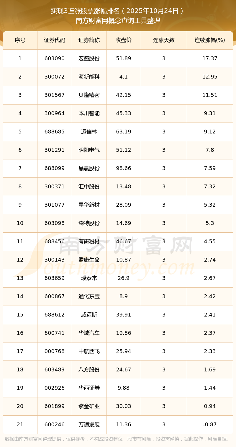 【今日股市行情】2025年10月24日21只股票實(shí)現(xiàn)3連漲!