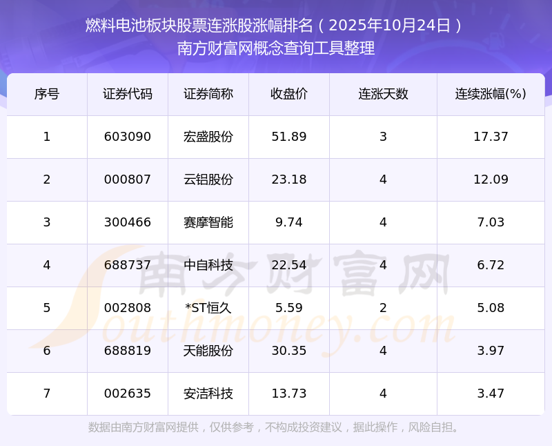 2025年10月24日燃料電池板塊股票連漲股漲幅排名